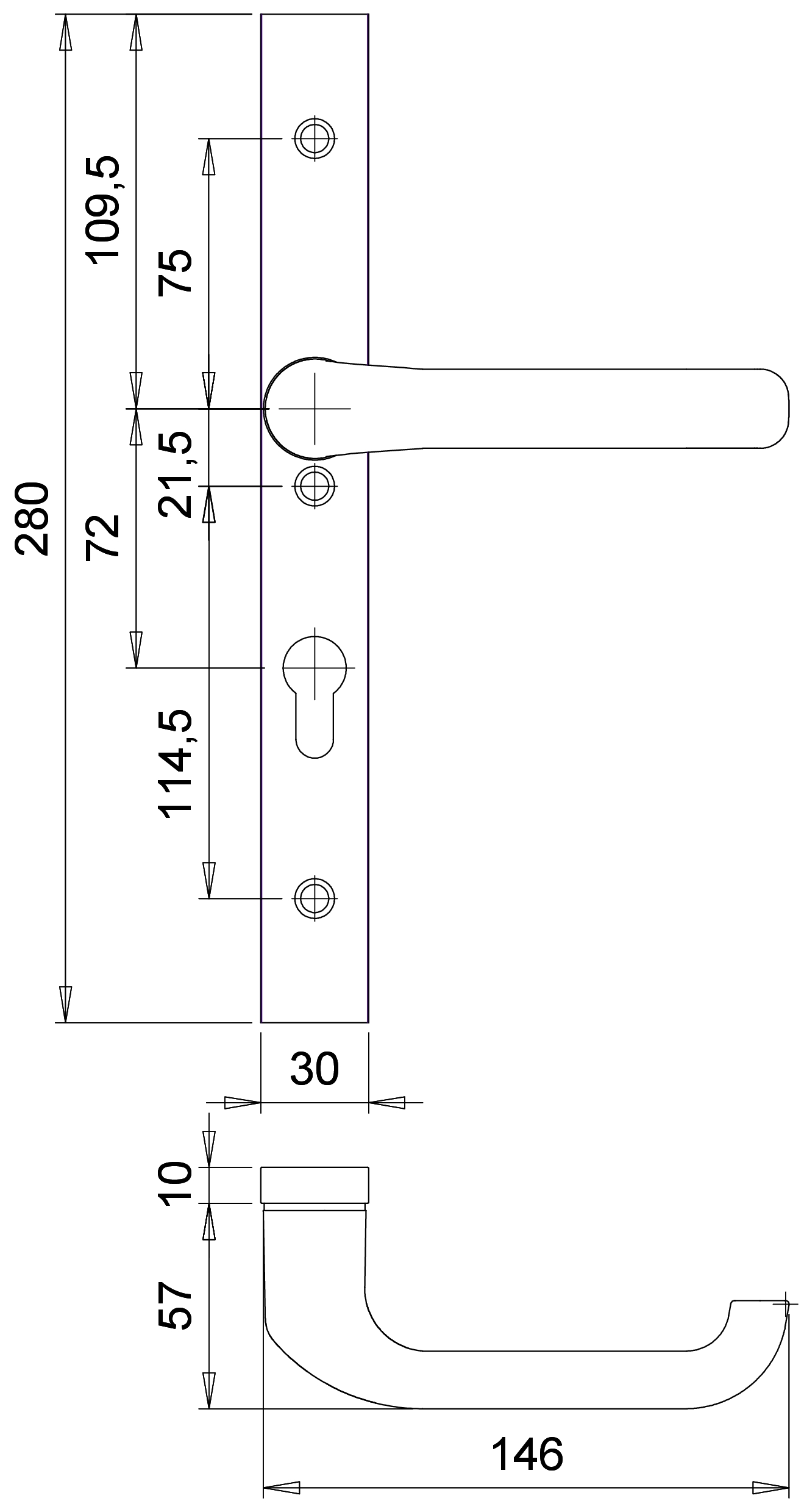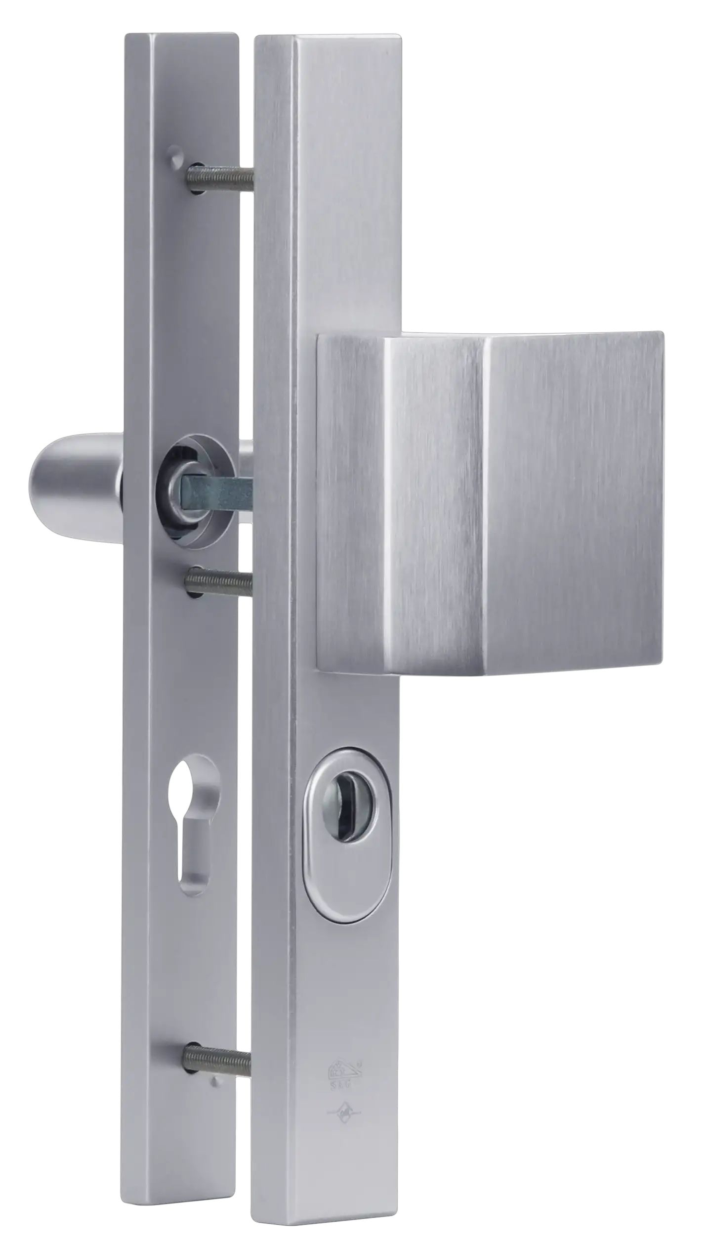 De Dieckmann serie Holland-XXL is een veiligheid smalschild garnituur van massief aluminium volgens de DIN 18257, NEN 5089 met keurmerk SKG***®. Buitenzijde met cilinder-kerntrekbeveiliging, met vaste greep en stalen nokken Ø10. Of buiten en binnen met vastdraaibare deurkruk met veer en zichtbare bevestiging met 3x M6 bouten incl. 8mm stift.