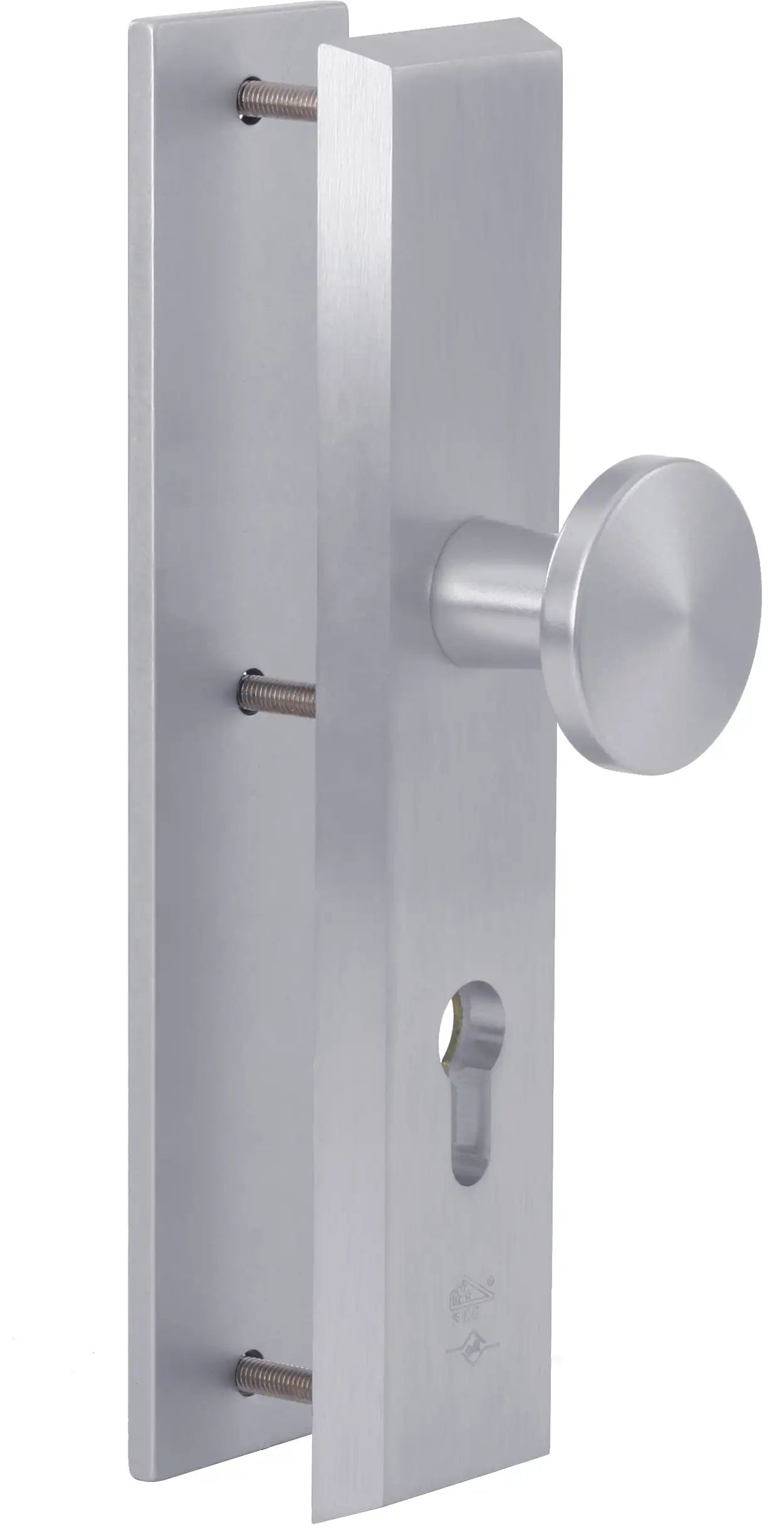 De Dieckmann serie Alpha is een veiligheidsgarnituur van massief aluminium volgens de DIN 18257, NEN 5089 met keurmerk SKG***®. Buitenzijde zonder cilinder-kerntrekbeveiliging, met vaste knop en stalen nokken Ø10 met gehard stalen plaatjes. Binnenzijde geheel blind en zichtbare bevestiging met 3 x M6 bouten incl. 8mm stift.