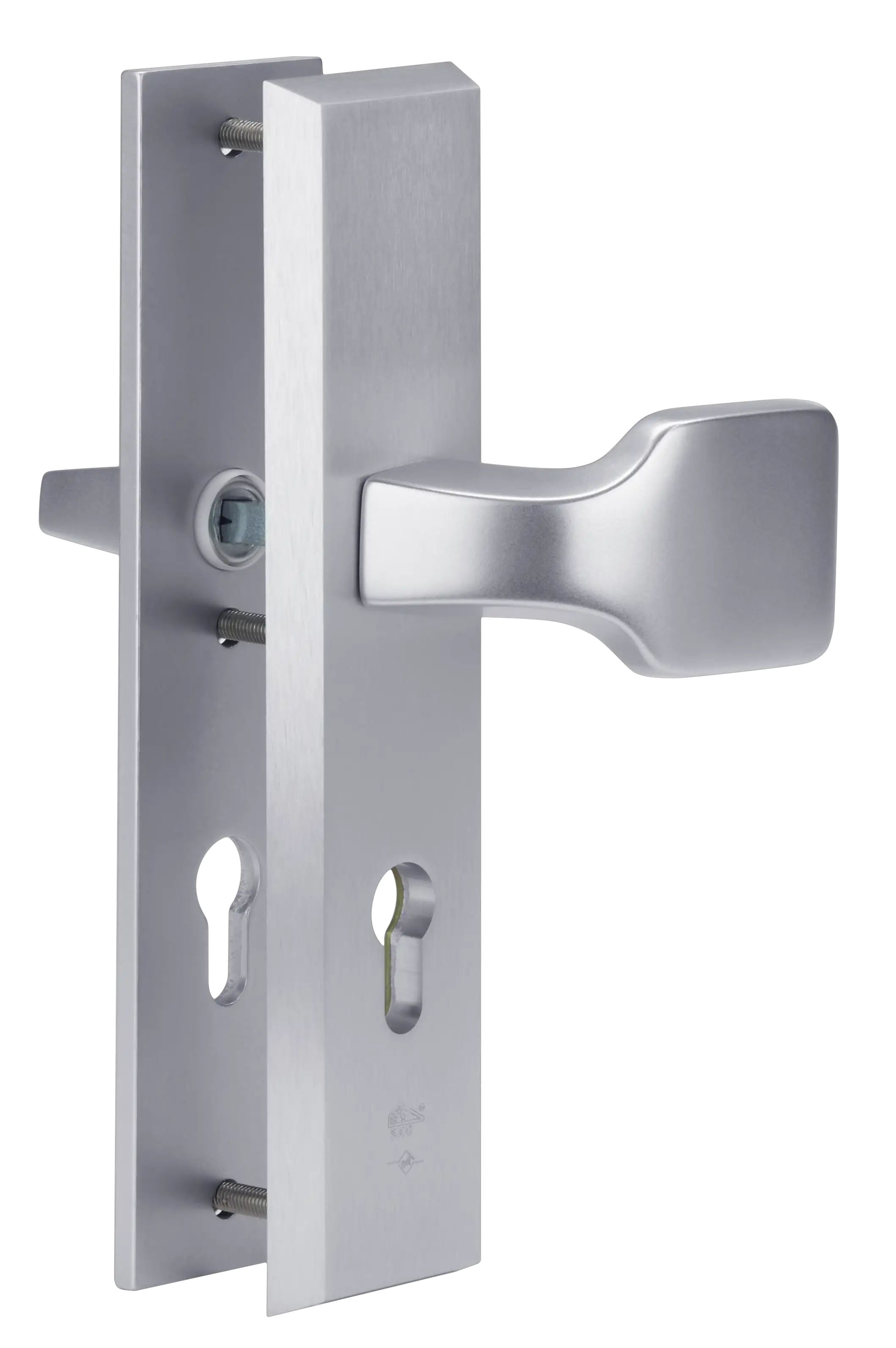 De Dieckmann serie Alpha is een veiligheidsgarnituur van massief aluminium volgens de DIN 18257, NEN 5089 met keurmerk SKG***®. Buitenzijde zonder cilinder-kerntrekbeveiliging, met deurkruk of vaste greep/knop en stalen nokken Ø10 met gehard stalen plaatjes. Binnenzijde met deurkruk gatdeel en zichtbare bevestiging met 3 x M6 bouten incl. 8mm stift.