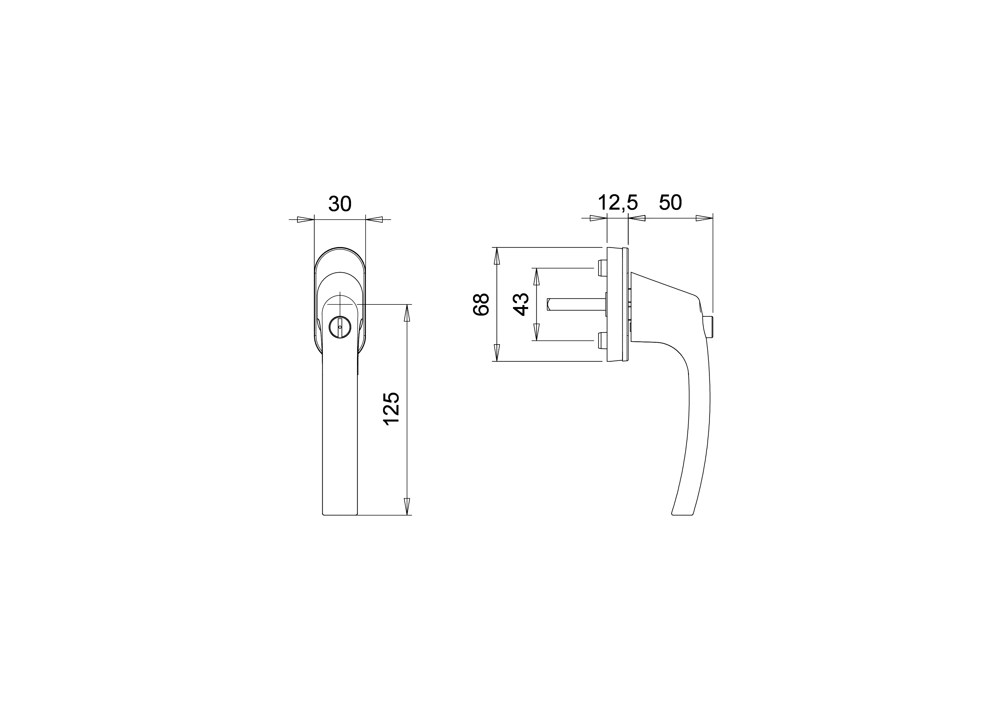 Dieckmann serie Minas venstergrepen bestaan uit: kunststof onderrozet met nokken Ø10 en aluminium greep met sleutel en afdekrozet